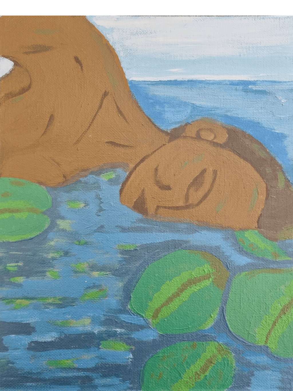 Lying on her side, she faces what appears to be a pond—quiet and deep, scattered with water lilies floating in perfect stillness. Just beyond it, the landscape opens into an endless horizon, where a sparkling ocean laps gently at the edge of the scene.