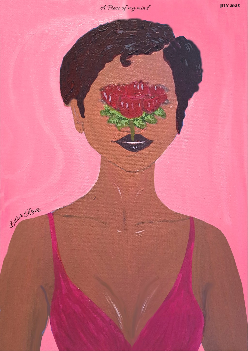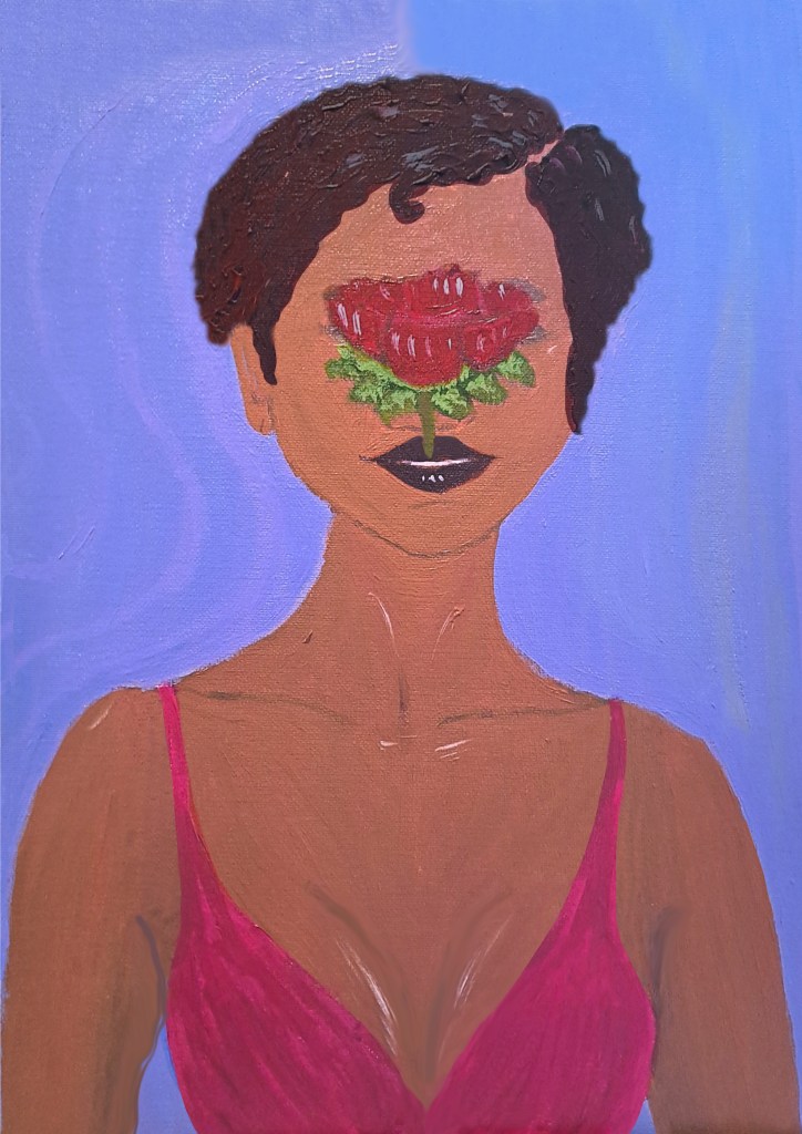 This is a self portrait inspired by Rene Magritte, Untitled (Woman’s Face covered by a Rose) (1965)