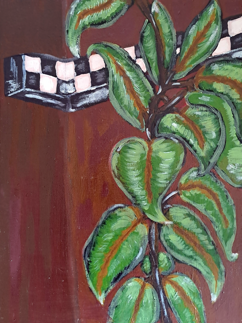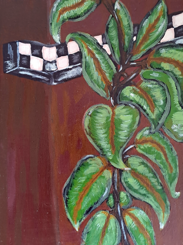 There’s a moment in the painting that came from real life a small, almost clumsy encounter. I stepped out and bumped my foot into the rubber plant that had been quietly occupying the corner of the room. It had been placed there months ago, almost as an afterthought, a soft sentinel guarding the emptiness. I hadn’t noticed how much it had grown.
