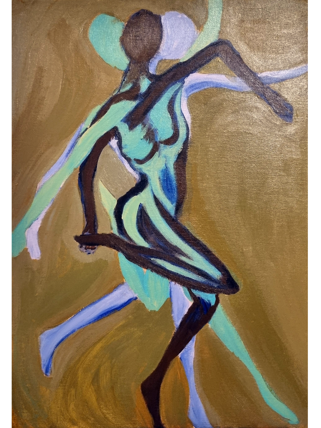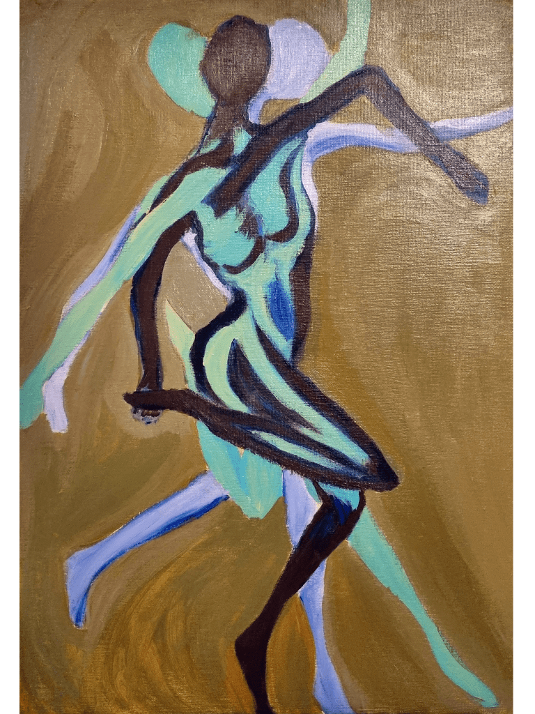 This painting emerged from that tension between movement and mystery, between embodiment and estrangement. The central figure, rendered in deep brown and turquoise, stretches across the canvas in a dynamic pose, limbs exaggerated and alive. Behind it, ghostlike silhouettes in soft blues, greens, and lavender echo its motion, as if past selves or emotional shadows are dancing alongside.