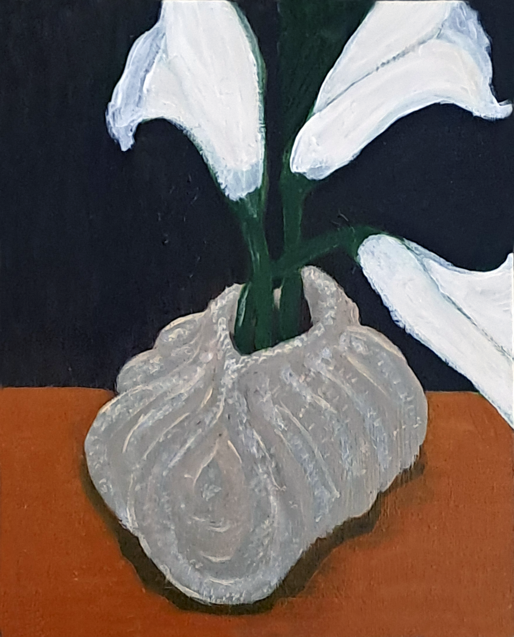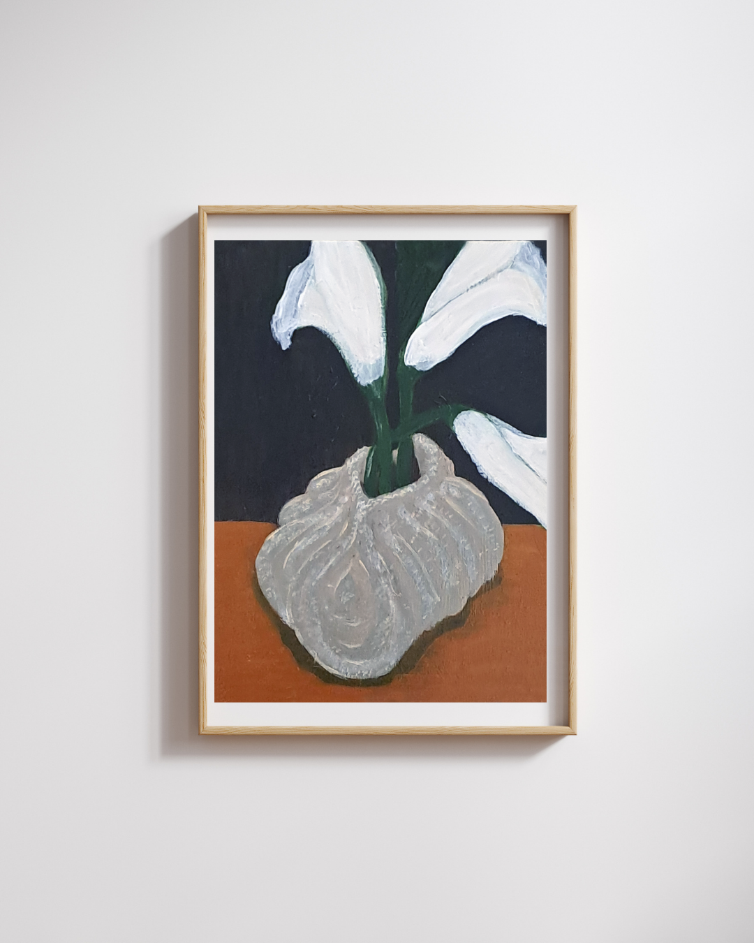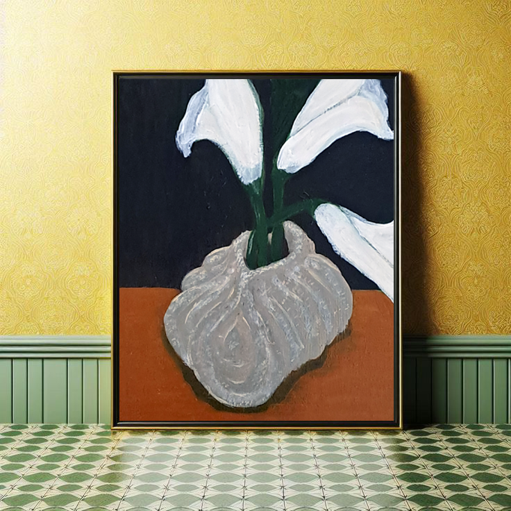 Inspiration: This piece celebrates the timeless beauty of calla lilies symbols of purity, rebirth, and quiet strength. The textured ceramic vase adds depth and character, while the dark backdrop enhances the flowers’ radiant simplicity.