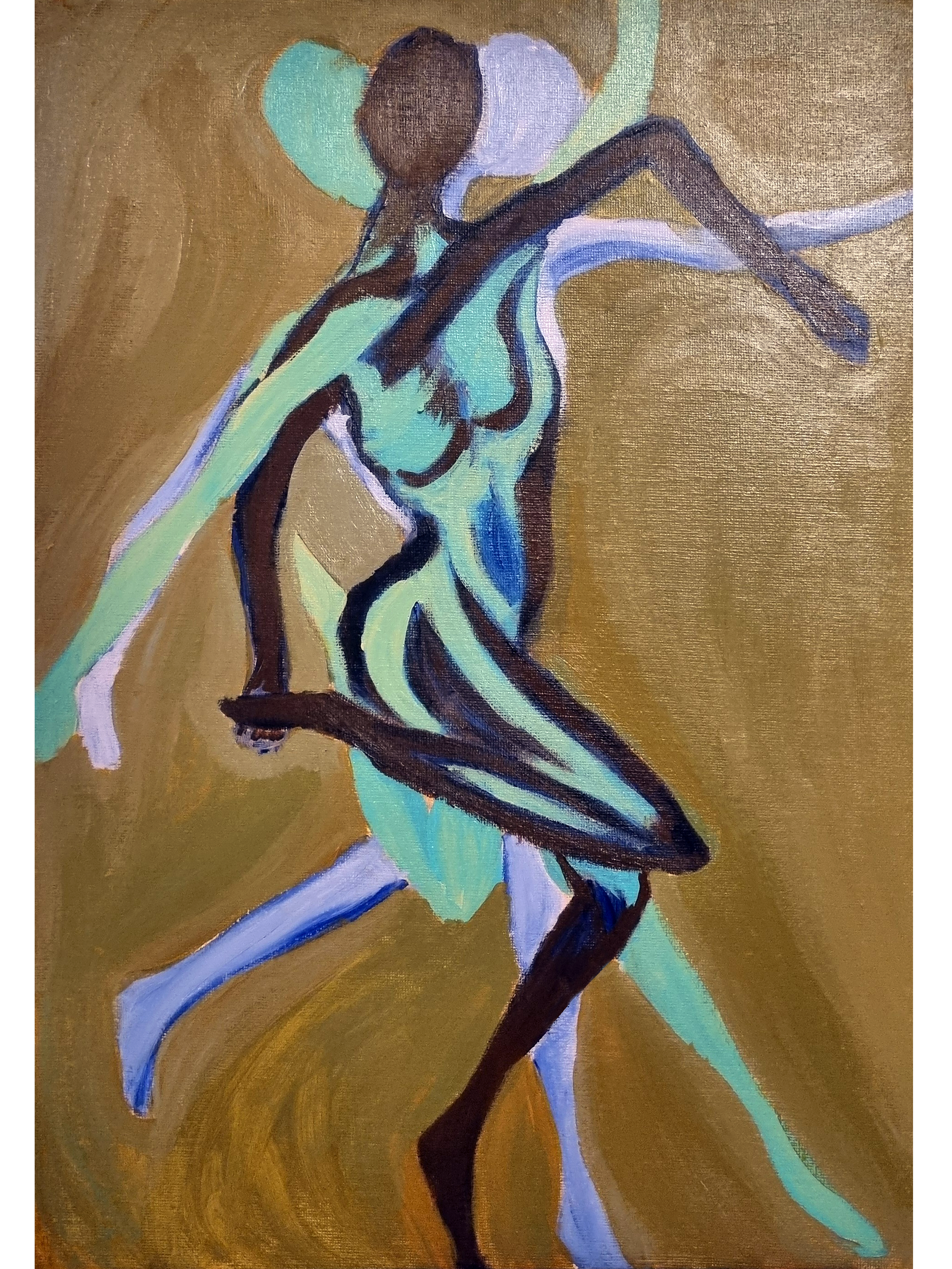 This painting emerged from that tension between movement and mystery, between embodiment and estrangement. The central figure, rendered in deep brown and turquoise, stretches across the canvas in a dynamic pose, limbs exaggerated and alive. Behind it, ghostlike silhouettes in soft blues, greens, and lavender echo its motion, as if past selves or emotional shadows are dancing alongside.