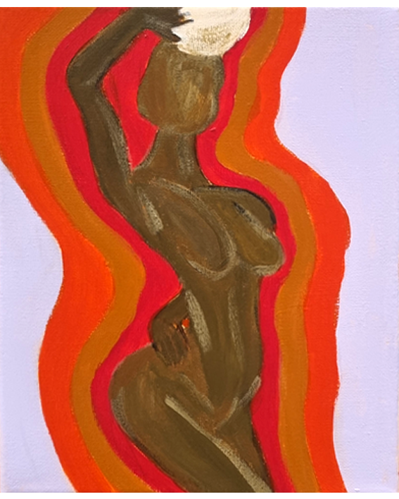 This painting was born from that space. A figure rendered in earthy brown tones stands in a dynamic pose—one arm raised, holding a white vessel, the other resting on the hip. The body is simplified, stylised, but full of presence. Surrounding it are undulating bands of red and orange, flame-like and intense, vibrating against a pale lavender backdrop.